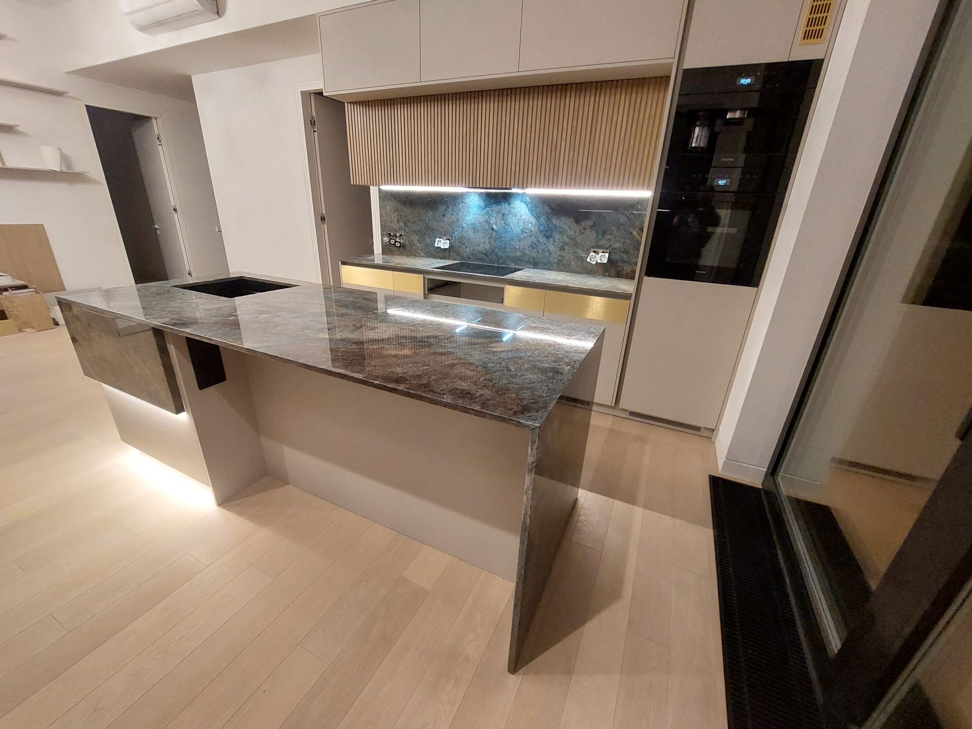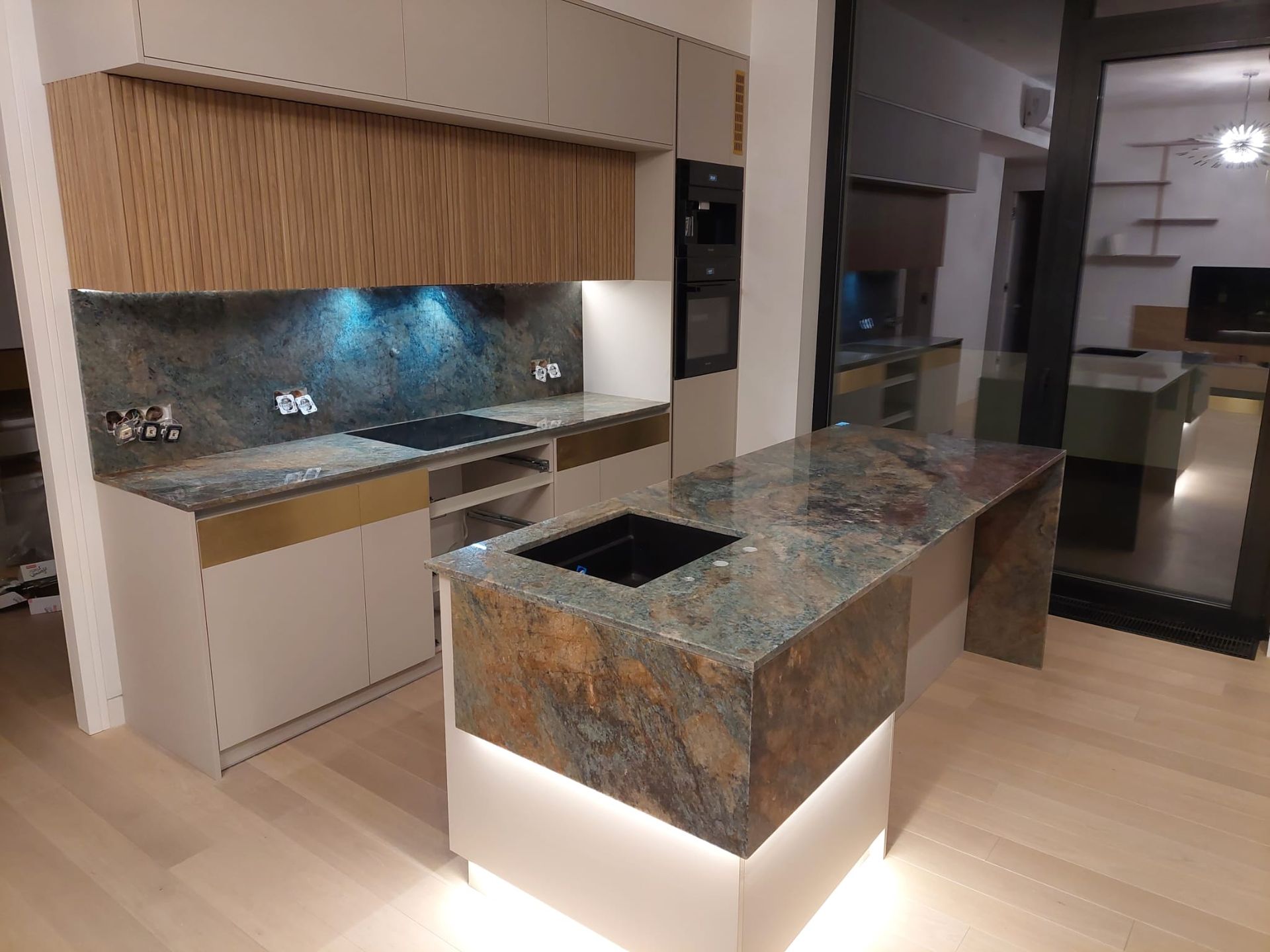 Кварцит Jeribe Blue, кухонная столешница с островом, Mežaparks